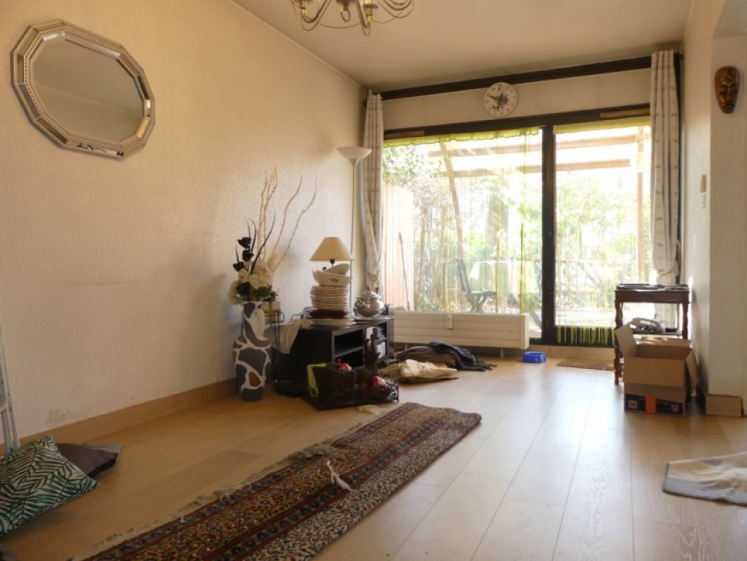 Au rez-de-chaussée : un lumineux séjour donnant directement sur une terrasse, ainsi qu’une cuisine fonctionnelle.