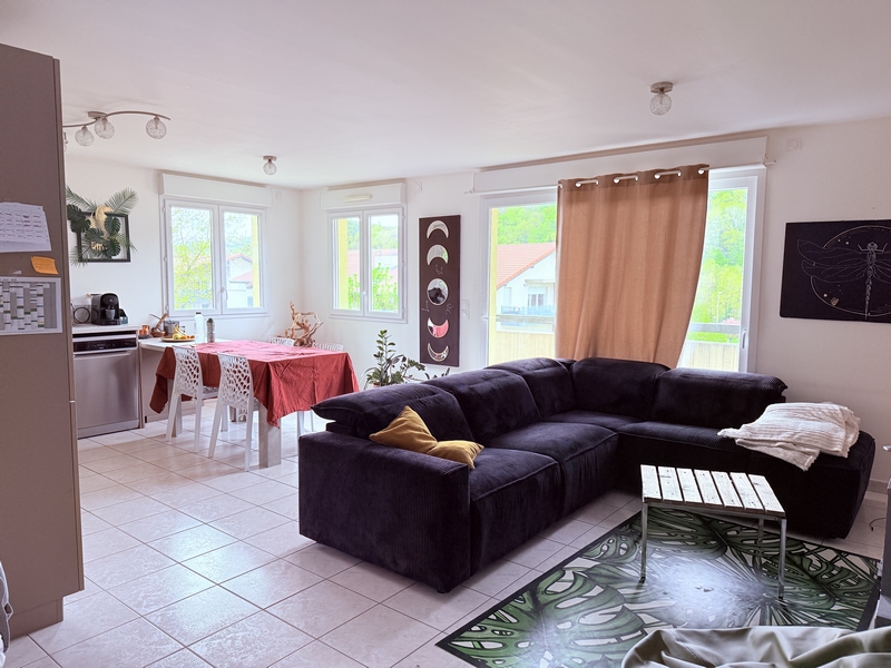 Frangy Route d'Annecy, au sein d'un immeuble bien entretenu, au 3ème étage, appartement de Type 4 de 86m2 comprenant hall avec placard, salon-séjour avec cuisine ouverte et terrasse plein sud, trois chambres, salle de bains, garage et une place de parking privative, loyer 1220 € + 70 € de charges, FA 900 €, libre le 8 juillet